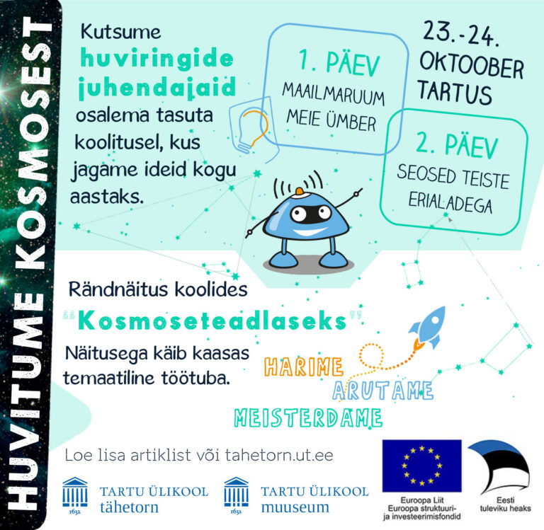 Projekt kestab kuni 2020. aasta 31. märtsini ja loodame, et selleks ajaks on Eestis kosmoseteemalisi huviringe oluliselt rohkem. Projekti toetatakse Euroopa regionaalarengu fondist. Lisateavet koolituse, näituse ja teiste tegevuste kohta leiate Tartu tähetorni kodulehelt (tahetorn.ut.ee).