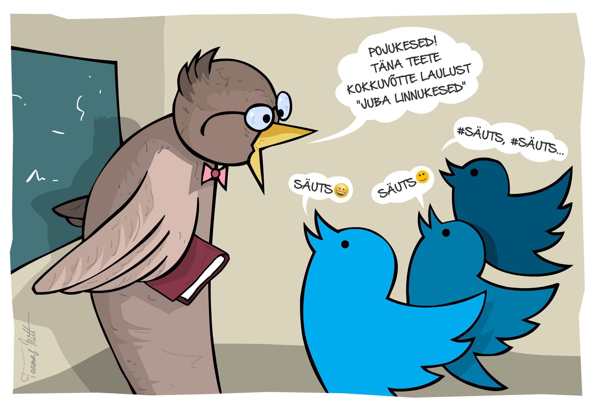 Pojukesed! Täna teete kokkuvõtte laulust „Juba linnukesed”. Joonistus: Toomas Mitt