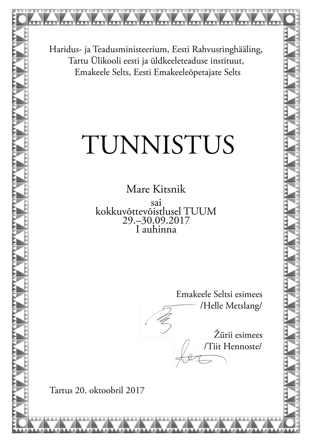 Kokkuvõtte­võistluse „Tuum” diplom.