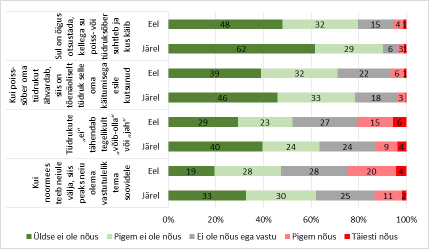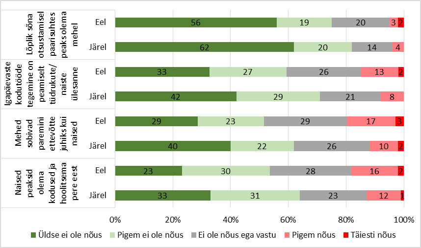 Seevastu nõustus pea iga viies õpilane eeluuringus väitega, et mehed sobivad paremini ettevõtet juhtima ning naine kodu ja pere eest hoolitsema. Päris arvukalt (20–25%) oli ka noori, kes olid nõus arvamustega, et tüdruku „ei” tähendab tegelikult „võib-olla” või „jah” ning endale joogi välja teha lasknud neiu peaks tulema noormehe soovidele vastu. Need tulemused näitavad, et osa noortest pooldab endiselt iganenud ja ebavõrdseid soosuhteid: meeste ja naiste kuulumist ühiskonna eri sfääridesse, nende erinevat võimekust, domineerimis-allumissuhteid ning uskumust, et naisel ei sobi soovitut otsesõnu väljendada.