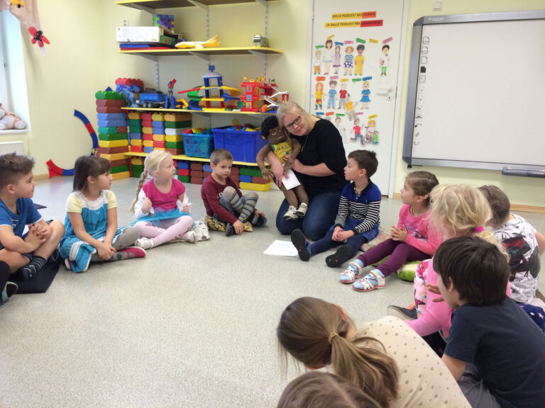 Lepatriinude rühma lapsed harjutavad sotsiaalseid oskusi koos õpetaja Liina Viilukasega. Probleemid, mida nukuga lahendatakse, valib õpetaja just rühma vajadustest lähtuvalt. Fotod: Tiina Vapper ja Suitsupääsupesa lasteaed