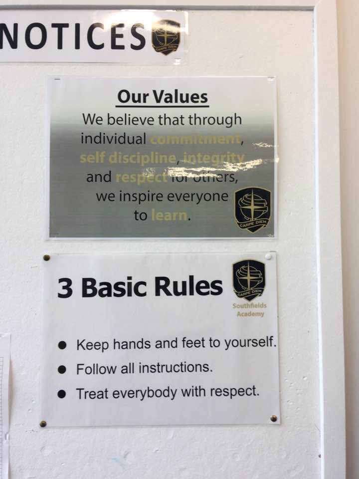 Kooli koridoridesse on tõmmatud kollased eraldusjooned, tagamaks vasakpoolne liiklus. Klassid on varustatud koridoripoolse aknaga, tänu millele saavad teised töötajad tunni käiku jälgida. Kõikjal on seinad varustatud plakatitega, mis meenutavad kooli kolme põhireeglit: „Oma käed ja jalad hoia endale!” (vältimaks multikultuurses seltskonnas hõlpsasti tekkivaid vääritimõistmisi), „Järgi kõiki reegleid!”, „Austa teisi!”. Tundi segavad õpilased eemaldatakse klassist ja nendega tegeldakse eraldi. Mobiiltelefonide kasutamisel selleks mitte ettenähtud ajal konfiskeeritakse need koheselt. Kooli reeglite vastu eksinud õpilased pannakse järelvalvaja pilgu all tegema kogukondlikku tööd, näiteks koristama.