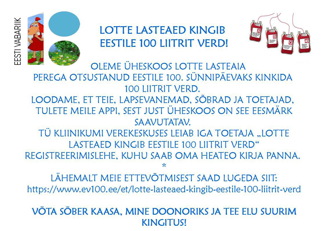 Tartu Lotte lasteaia õpetajad on lubanud loovutada Eesti sünnipäeva puhul sada liitrit verd. Idee autor, õpetaja Kätlin Ilves räägib, et terve eelmine aasta oli lasteaias pühendatud heategevusele. Suurim ettevõtmine oli see, et kogu sügisese mihklipäeva laada tulu, üle 600 euro, annetati heategevusfondile „Minu unistuste päev”, et aidata täita raskelt või krooniliselt haigete laste unistusi. Kuna Kätlin Ilves ise on juba kümmekond aastat doonoriks käinud ja teab, kui hädasti doonoriverd vajatakse, kutsus ta ka teisi üles aitama.