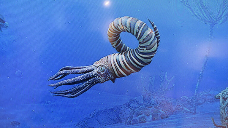 Jaagup Metsalu ehitatud nautiloidi mudel. See elukas liikus saba ees ega näinud hästi, kuhu ta läheb, mis võis olla tema väljasuremise põhjus.