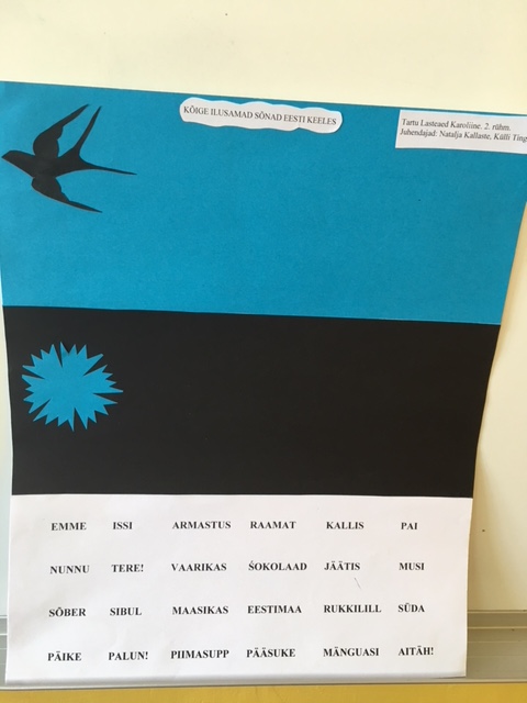 Hulgaliselt laekus töid meie kodulinnast Tartust. Tartu Karoliine lasteaia lapsed ja õpetaja üllatasid meid suure hulga eriilmeliste näitusepiltidega, nende seas ühistööna valminud sinimustvalge plakatiga, kuhu rühma lapsed olid kirjutanud nende arvates kõige ilusamad sõnad eesti keeles.