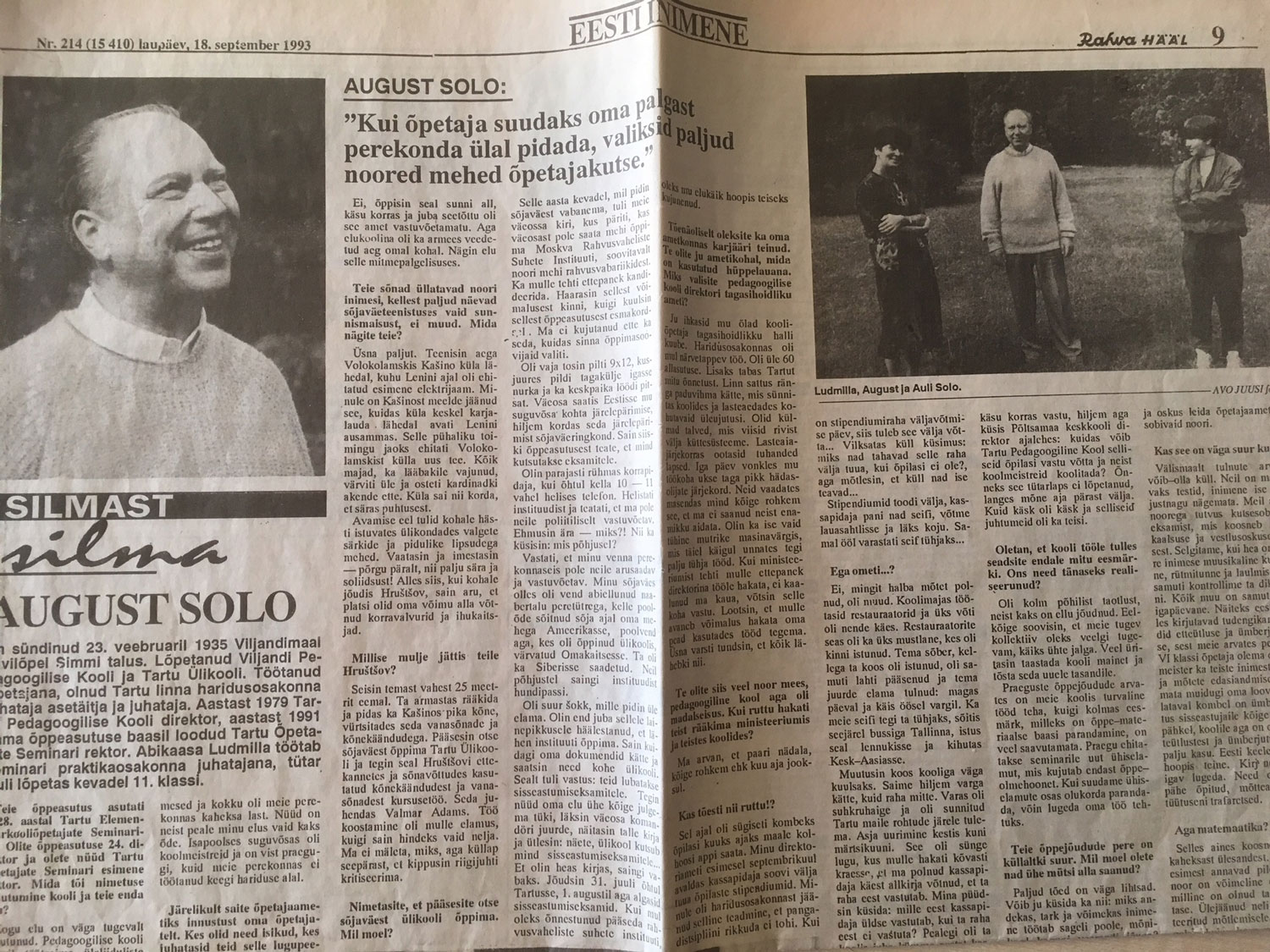 Veerandsaja aasta eest (1994) rääkis Tartu õpetajate seminari rektor August Solo ajalehele Rahva Hääl oma elust ja tööst. Muuhulgas sai lugeja teada, et ta oleks võinud teha ametnikuna karjääri, aga jäi siiski truuks kooliõpetaja hallile kuuele. Ta tahtis teha tööd, kus tuleb kasutada oma pead.
