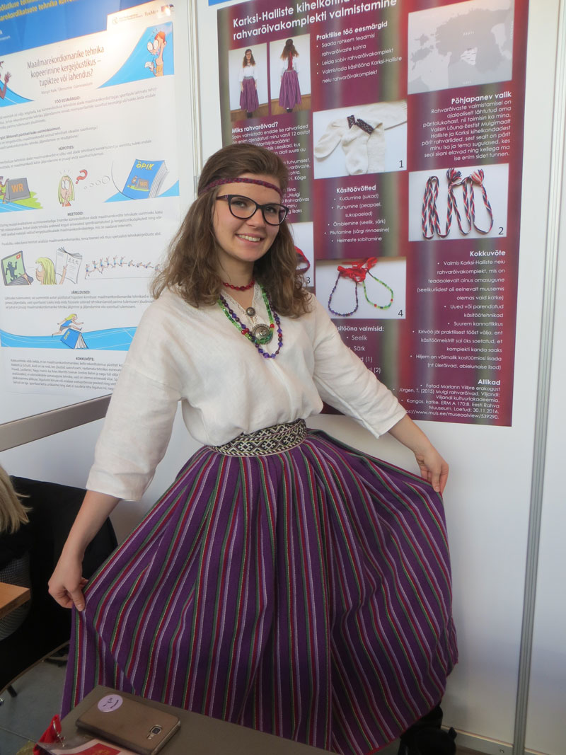 Tallinna prantsuse lütseumi neiu Caro Kristiine Kallas, kes on elupõline rahvatantsija, esitles enda valmistatud rahvarõivaid. Töö algas muuseumis mustreid-lõikeid uurides. Ideest teostuseni kulus 300 töötundi.