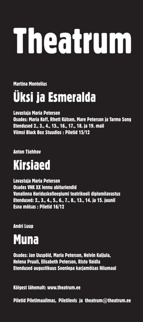 Suve teises pooles ootame publikut Soonlepa karjamõisa Hiiumaal vaatama näidendit „Muna”, mille autor ja lavastaja on Andri Luup. Osades Jan Uuspõld, Maria Peterson, Helvin Kaljula, Helena Pruuli, Elisabeth Peterson ja Risto Vaidla. Etendused toimuvad augusti keskel ning täpsed toimumisajad on peatselt kirjas meie kodulehel www.theatrum.ee.