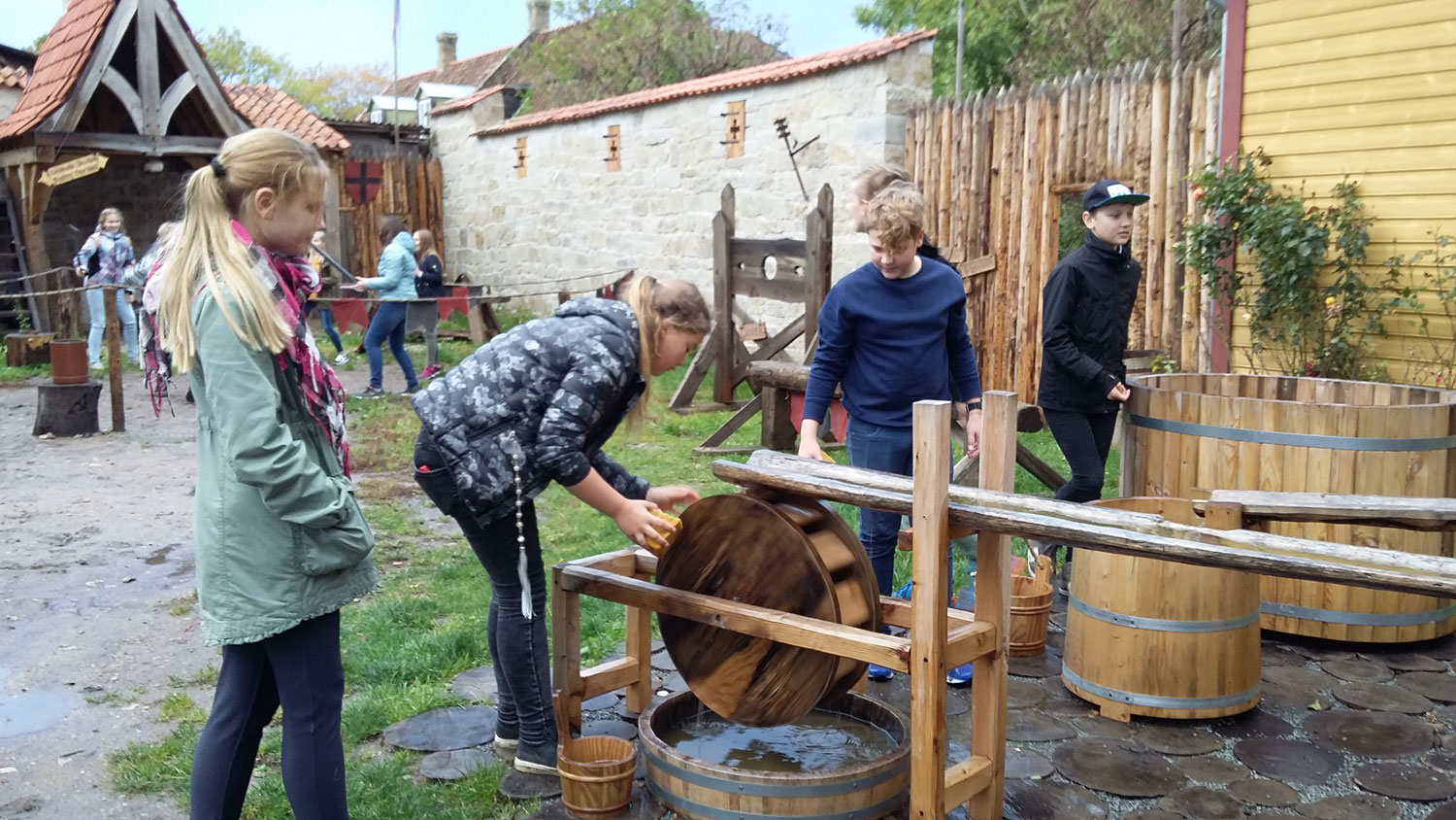 Veel on hoovis vana töötava rataskaevu kõrval ainulaadne veemängu ala. Tünnid, rennid, vesiratas ja pesupalid moodustavad põneva süsteemi, mis eelmisel suvel kütkestas keskuse nooremaid külastajaid jäägitult. Hoovi taganurgas asuvas sepikojas saab vermida endale mündi, milleks on hertsog Magnuse veeringu koopia. Magnuse veeringuid vermiti Kuressaares aastal 1564. Vibutiiru kõrval ootavad proovimist suuremad ja väiksemad kiviheitemasinad. Välja on pandud ka tolleaegseid puutöövahendeid, mis muuhulgas näitavad, et ka ilma elektrimootorita saab tööle panna nii puuri kui ka treipingi. Külalisi võtavad vastu ja kõige kohta jagavad selgitusi keskaegsetes rõivastes majordoomused.
