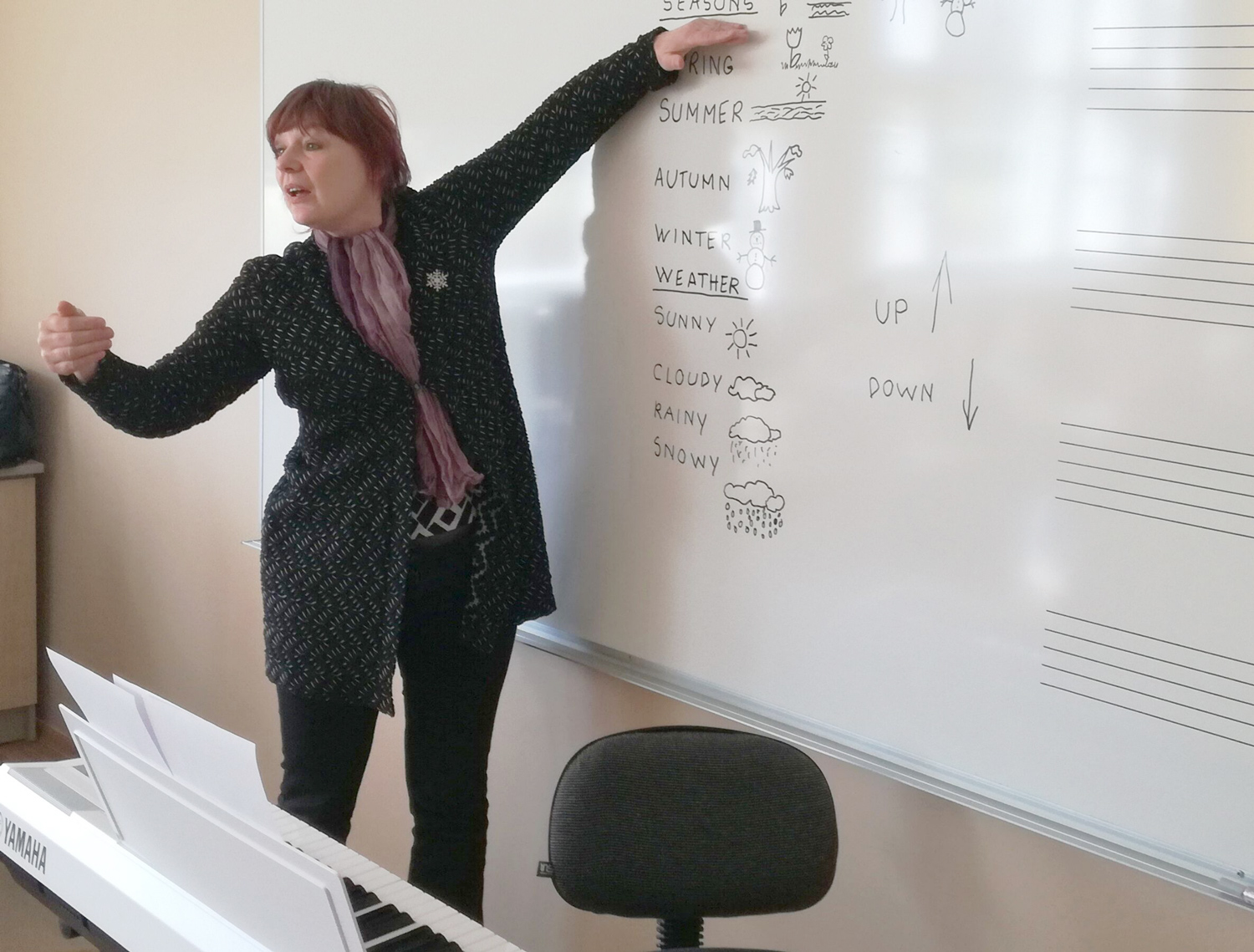 Õpetaja Elina Peri muusikatund, mis on ühtlasi ka inglise keele tund. Lapsed harjutavad astmekõrguste käemärke ja õpivad uusi ingliskeelseid sõnu. Teemaks on ilm ja aastaajad. Foto: Karmo Lugima