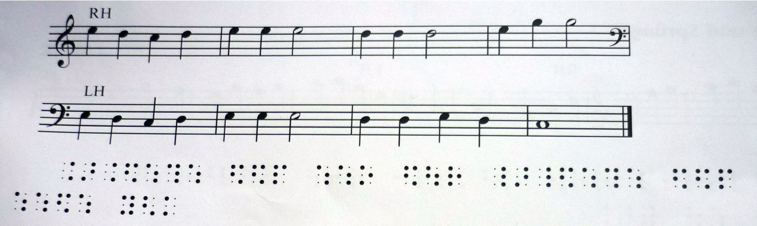 Miks on vaja just eestikeelseid selgitusi? Toon näite selle kohta, kui keeruline on alustavale lapsele punktnoodikiri. Muusikas kasutatakse teatavasti tähti C, D, E, F, G, A, B. Tavalises punktkirjas vastab tähele A number 1, kuid Braille’ punktnoodikirjas tähistatakse A (la) noodikõrgust numbritega 24 (loe: kaks, neli). Aga see pole veel kõik. A on 24 ainult siis, kui tegemist on kaheksandiknoodiga. A veerandnoodina on 246, poolnoodina 234, täisnoodina 2346. Lisaks pausid. 1/8-noodi paus on 1346; veerandnoodipaus 1236, poolnoodipaus 136, täisnoodipaus 134. Seda kõike ongi vaja pimedale lapsele emakeeles selgitada.