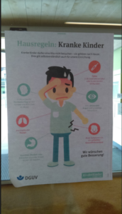 Lahke direktor Petra Röger tutvustas meile asutuse töökorraldust, näitas rühmi ja spetsialistide tööruume ning õueala. Nii nagu Eestiski, viivad rühmas kolm töötajat läbi õppe-ja kasvatustööd kella 7.30–16. Kõik nad tegelevad lastega ning rühmaruume koristavad õhtul koristajad. Pesuteenust osutab lasteaia vastas asuv erivajadustega täiskasvanute keskus.