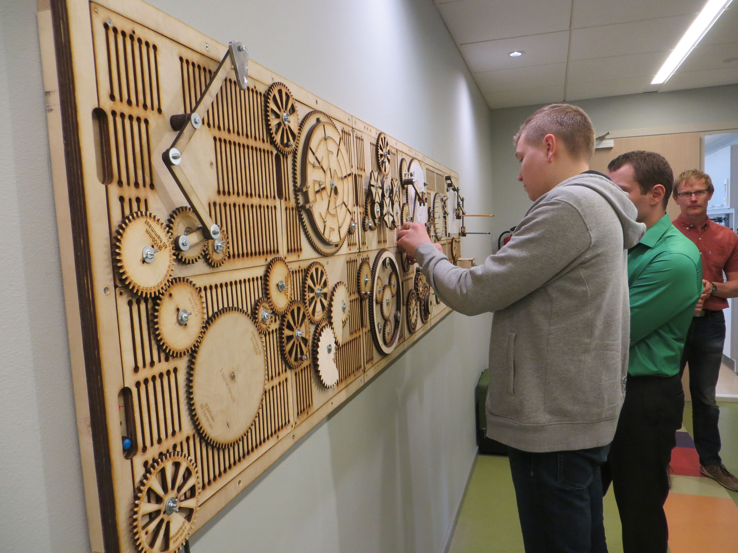 Mehaanikasein paigaldati füüsika­klassi ukse juurde, et õpilased saaks enne tundi uurida, näppida ja inspiratsiooni ammutada. Ja kes tunnist välja saadetakse, saab hammasratast kerida ja elu üle järele mõelda.