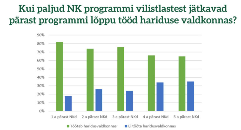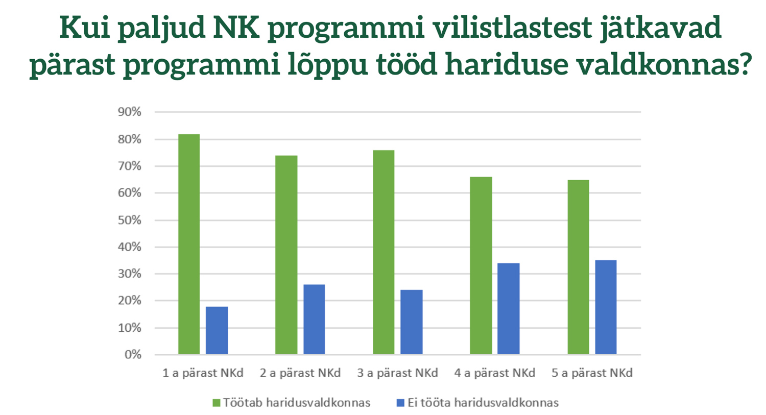 Samal ajal ilmnes, et mida rohkem aega on „Noored kooli“ programmist möödas, seda vähem osalenuid jätkab õpetamisega: kohe pärast programmi üle poole, viiendal aastal umbes veerand – ning üsna suur osa on vahetanud kooli. Vaid umbes kuuendik oli jäänud samasse kooli vähemalt viieks aastaks.