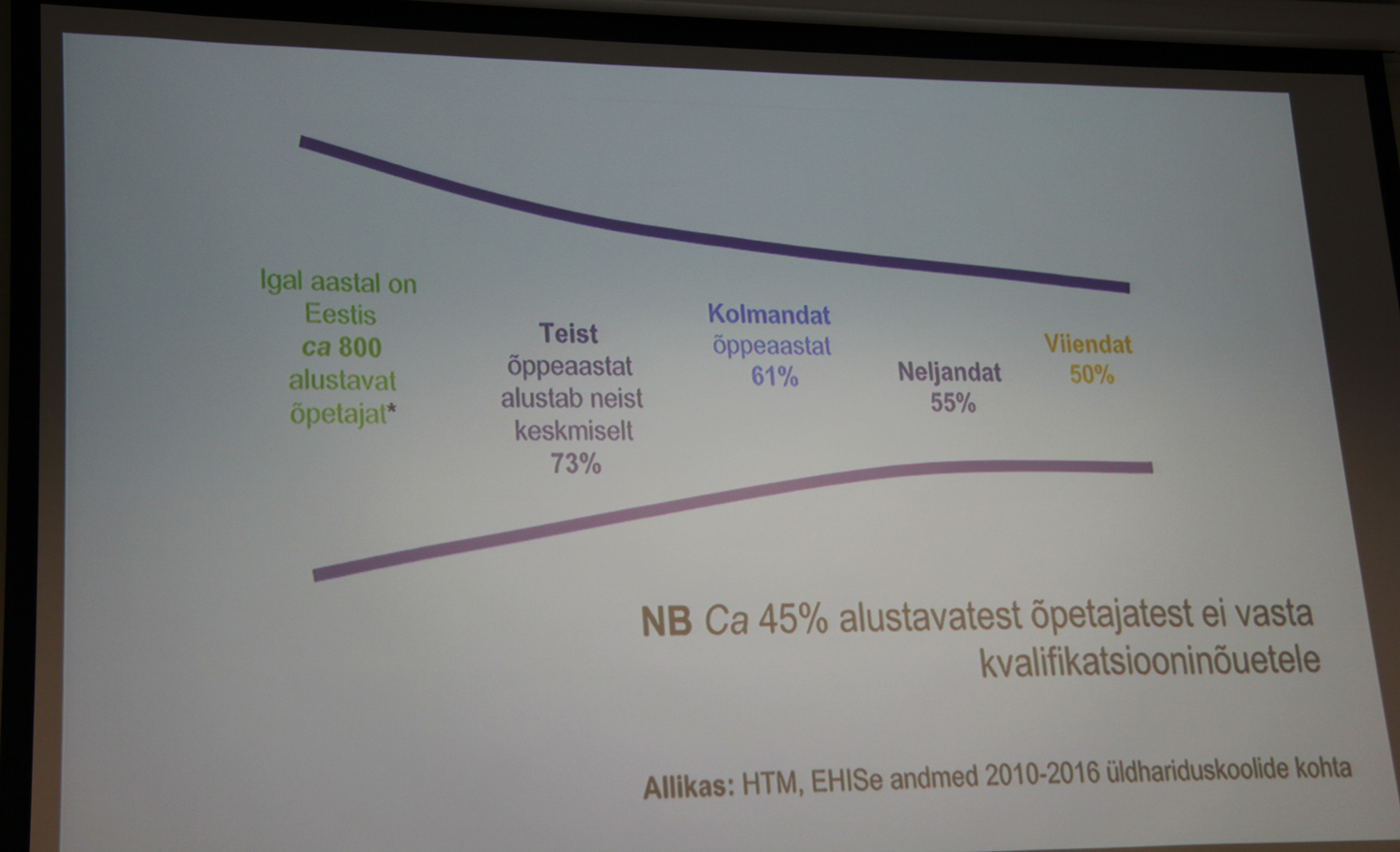 Triin Noorkõiv, alustavat õpetajat toetava kodanikuühenduse üks asutajaid ja eestvedajaid, selgitas üksikasjalikult, kuidas uued õpetajad koolist välja langevad. EHIS-e andmed näitavad, et Eestis läheb igal aastal esimest korda elus kooli tööle umbes 800 õpetajat. 1. septembril on koolid rahul, et neil on kõik vajalikud õpetajad olemas. Järgmisel aastal jätkab neist 800-st koolis õpetajana aga vaid 73%, kolmandal aastal 61%, neljandal 55% ja viiendaks aastaks on järel veel ainult pooled alustanutest.