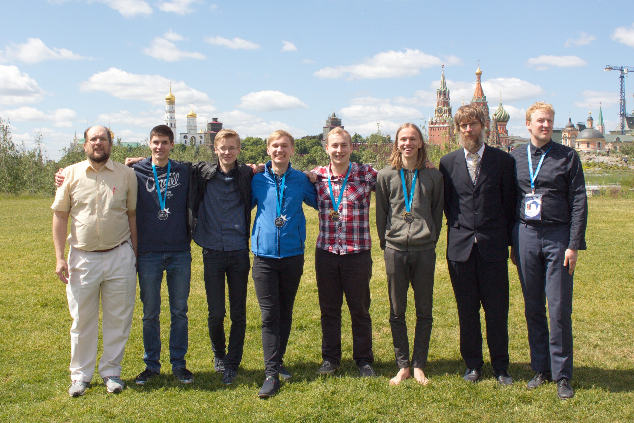 Eesti delegatsioon Euroopa füüsikaolümpiaadil Moskvas: vasakult Eero Uustalu, Konstntin Dukatš, Robin Haljak, Karl Paul Parmakson, Richard Luhtaru, Kaarel Kivisalu, Jaan Kalda, Oleg Košik. Foto: Eero Uustalu