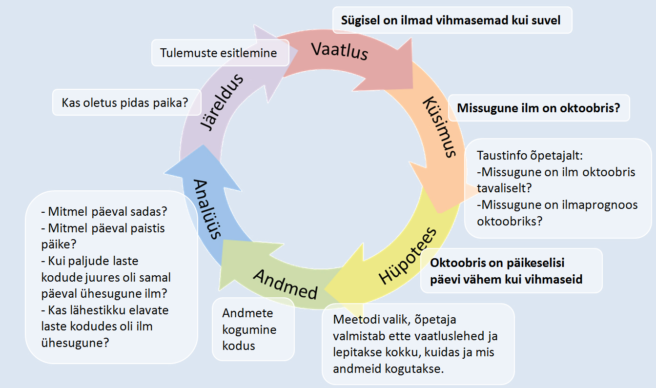 Lasteaias püstitatakse uurimisküsimus. Õpetaja aitab lastel saada teema kohta taustinfot. Sellele toetudes püstitatakse oletus (ehk hüpotees), näiteks: „Oktoobris on päikeselisi päevi vähem kui vihmaseid.“ Lepitakse kokku uurimismeetodites ja nende rakendamises. Iga laps saab endale ülesande iga päev kindlal ajal ilma vaadelda: kas puhub tuul, paistab päike või sajab vihma? Suuremad lapsed mõõdavad ka temperatuuri ja fikseerivad tulemused vaatluskaartidele.