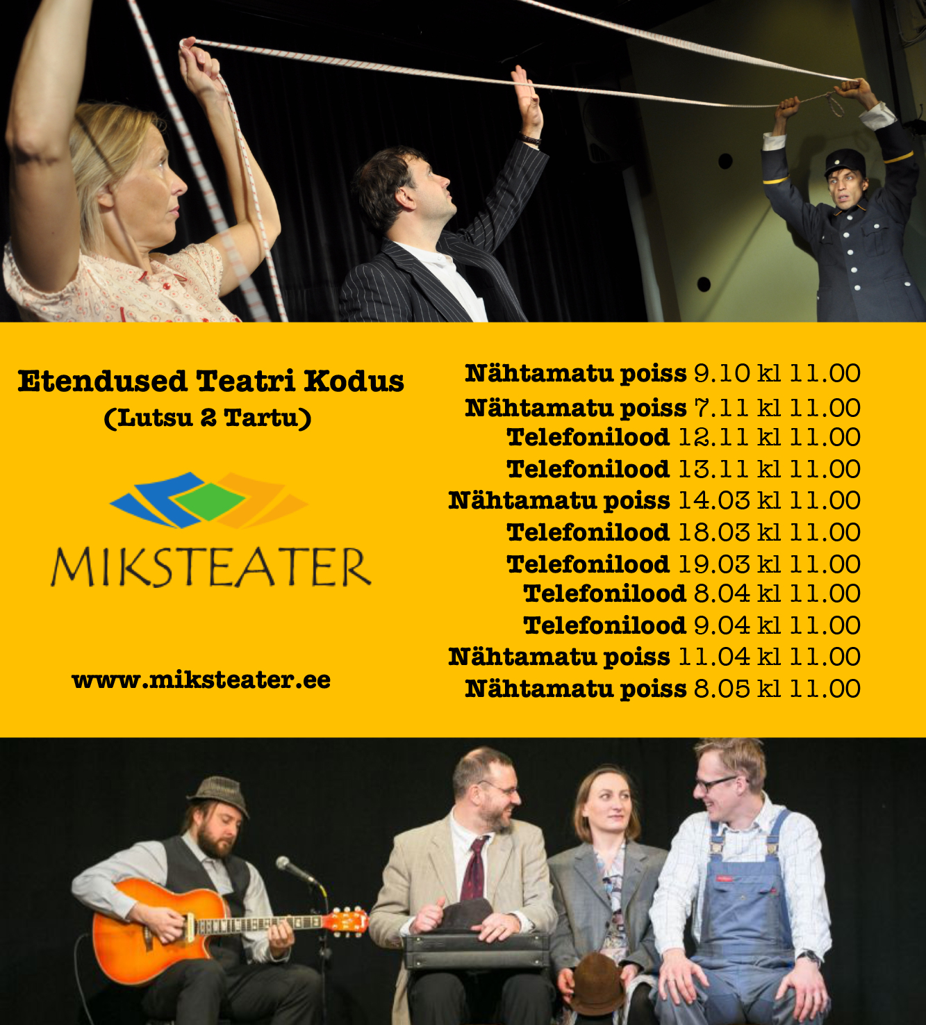 Tartu hubases Teatri Kodu saalis mängime läbi hooaja kaht menukat lavastust, mis sobivad nii lasteaialastele kui ka põhikooli nooremale astmele. „Telefonilood“ on lugu isast, kes on suure osa nädalast töö tõttu oma perest eemal. Tütar palub tal igal õhtul telefoni teel ühe muinasjutu rääkida. Mis toimub ühe väikese tüdruku hinges, kes näeb isa vaid pühapäeviti? Mida tunneb isa, kes on perest eemal kuus päeva nädalas? Kas lahus elav perekond on ikka perekond?