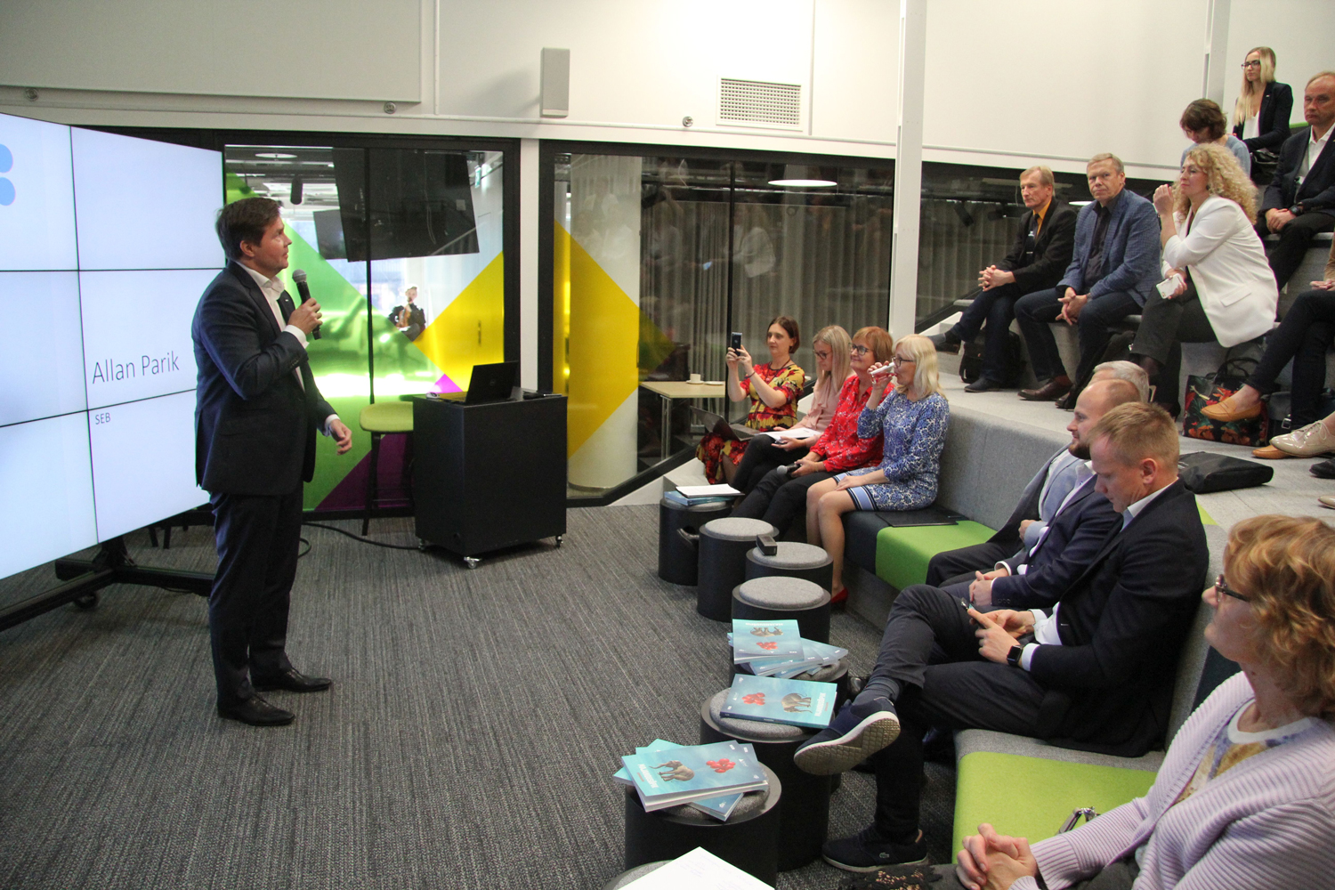 SEB Panga juhatuse esimees Allan Parik avaldas õpiku pidulikul presentatsioonil lootust, et noored lugejad saavad sellest õppematerjalist lisaks teadmistele ka innustust ning oskust mõelda suurelt. Foto: Raivo Juurak