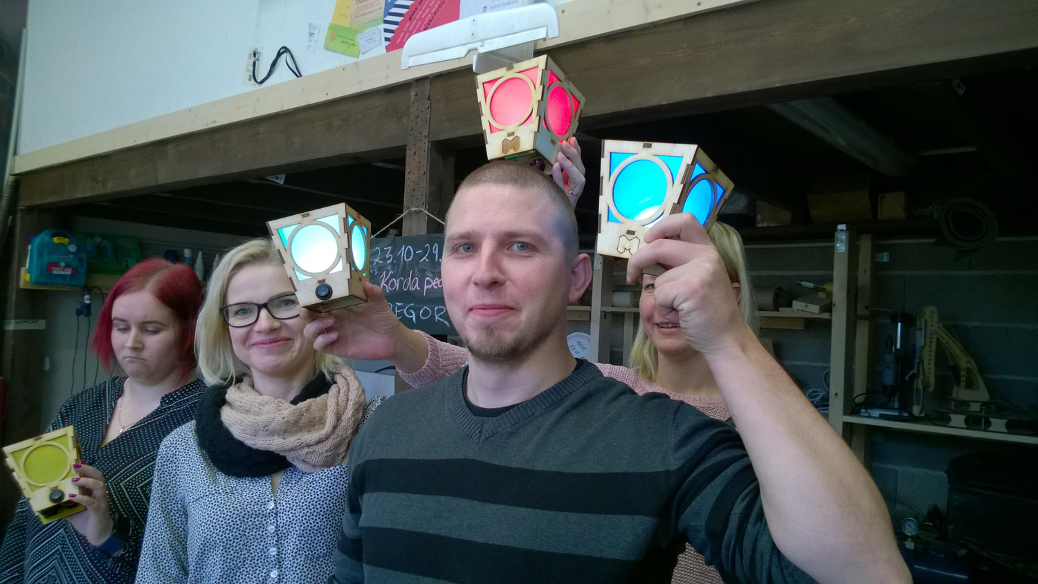 Ettevõtlikkus peitub igaühes, tuleb ainult õige pirn põlema saada. Järva-Jaani gümnaasiumi direktor Raigo Prants ja õpetajad Riina Raudsepp, Greete Treial ja Külli Kärner kogusid uusi mõtteid Tartu ettevõtluskülas ja SPARK Makerlabi töötoas. Foto: Järva-Jaani gümnaasium
