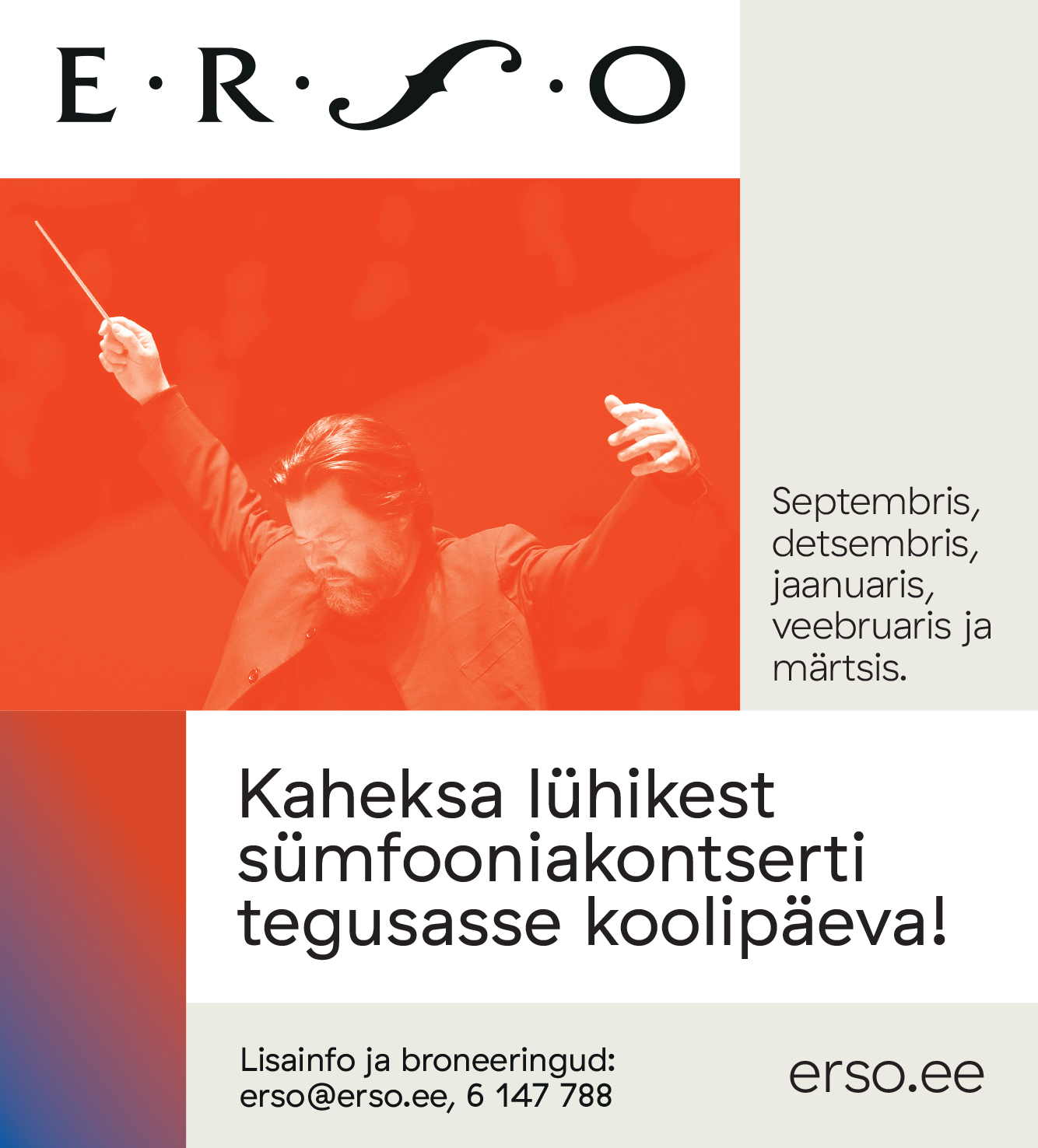ERSO päevastel kontsertidel on pileti hind õpilastele 6 eurot, õpetajatele on iga kümne pileti kohta üks pääse tasuta. Gümnaasiumiklasse ootame ka õhtustele kontsertidele. Vähemalt kümneliikmelistele õpilasgruppidele pakub ERSO sinna soodushinnaga pileteid.