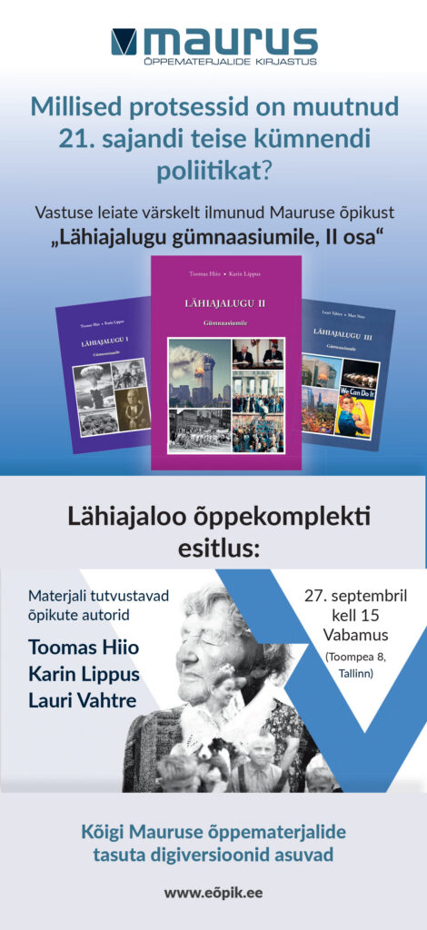 Millised protsessid on muutnud 21. sajandi teise kümnendi poliitikat? Vastuse leiate õppematerjalide kirjastuse Maurus uuest õpikust „Lähiajalugu gümnaasiumile, II osa“, mida tutvustatakse 27. septembril algusega kl 15 Vabamus (Toompea 8, Tallinn).