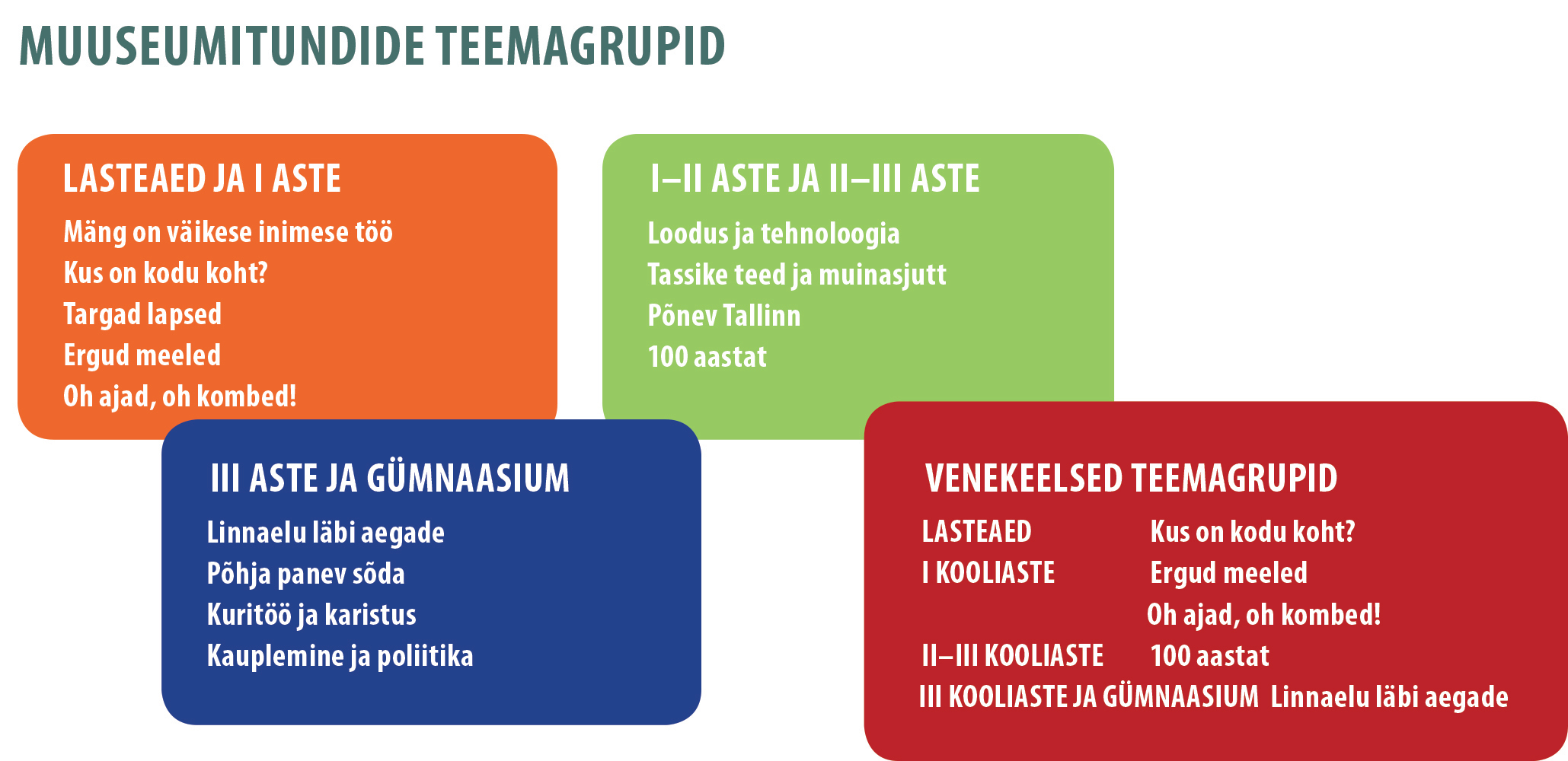 Kõikide teemagruppidega saab tutvuda meie kodulehel või 22. oktoobril toimuval Tallinna Linnamuuseumi Haridusturul.