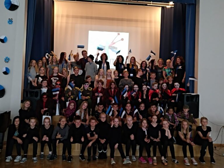 Projektiga seotud õpilased välismaalt ning meie koolist, kes toimetasid kaasa Eestis Peetri lasteaias-põhikoolis toimuval õppereisil. Pilt on tehtud vahetult pärast näidendi esitamist kooliperele ja otseülekannet YouTube’is. FOTO: IRENE CHUMILLAS MOTOS