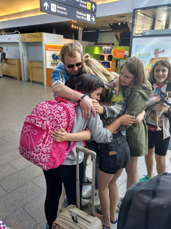 Emotsionaalne hüvastijätt lennujaamas. Peredes elavad õpilased said väga lähedasteks, sooviti kauemaks külla jääda. FOTO: KETTER LEEMET