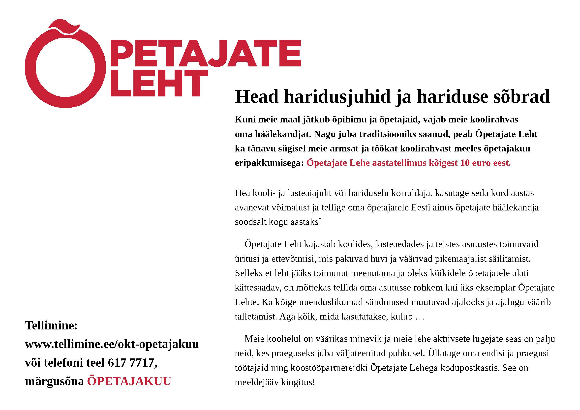 Nagu juba traditsiooniks saanud, peab Õpetajate Leht ka tänavu sügisel meie armsat ja töökat koolirahvast meeles õpetajakuu eripakkumisega: Õpetajate Lehe aastatellimus kõigest 10 euro eest. Tellimine: www.tellimine.ee/okt-opetajakuu