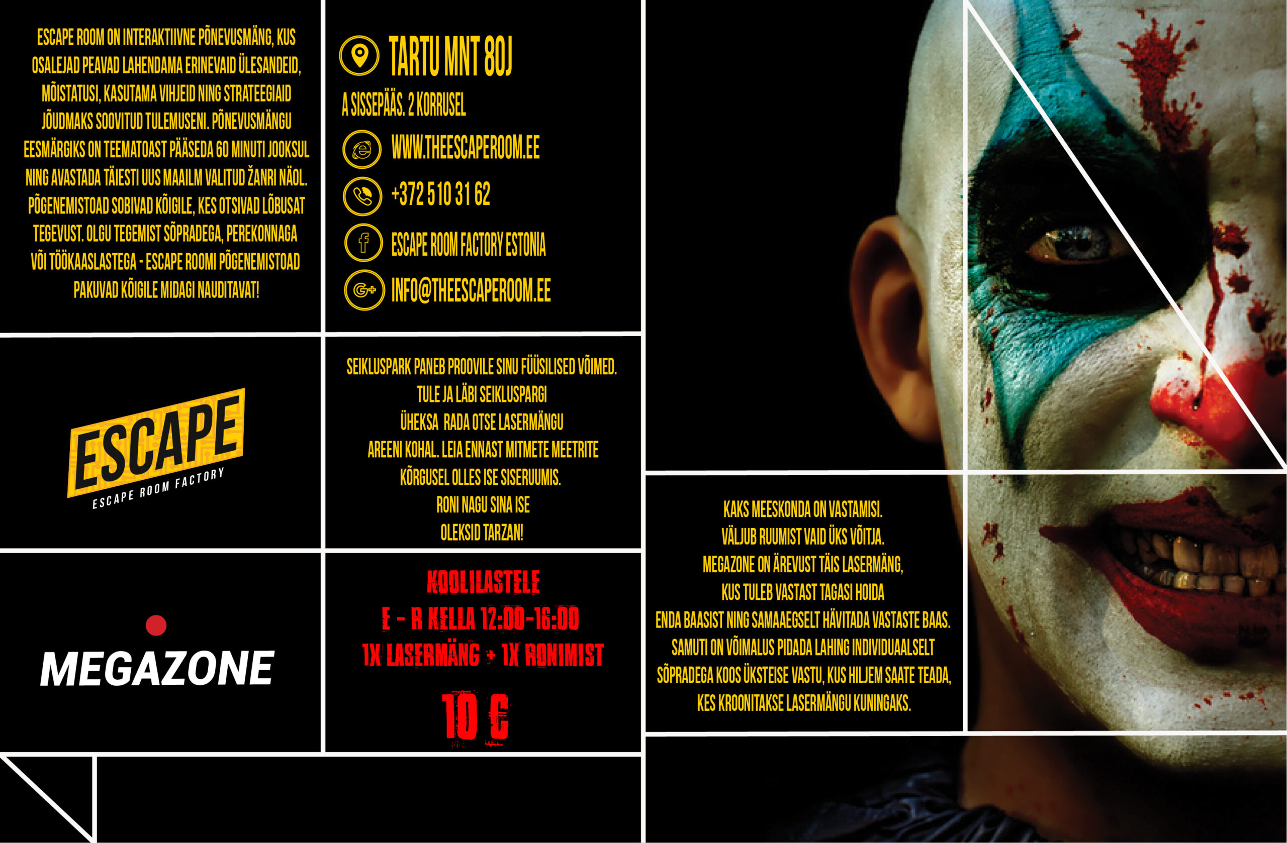 Escape Room Factory ja Megazone’i seikluskeskus Tallinnas aadressil Tartu mnt 80J ootab kooliõpilasi esimesest viimase klassini lahedalt aega veetma. Keskuses saab end proovile panna põgenemistoas, võistluslikus lasermängus ja ronimiskeskuses. Kokku on see suurepärane kooslus: ronimine tugevdab füüsist, lasermäng pakub võistlusmomenti ja arendab meeskonnatööd. Põgenemistoad panevad proovile igaühe nutikuse ja loogika ning õpetavad lisaks koostööle ka seda, et igaühe panus on oluline.