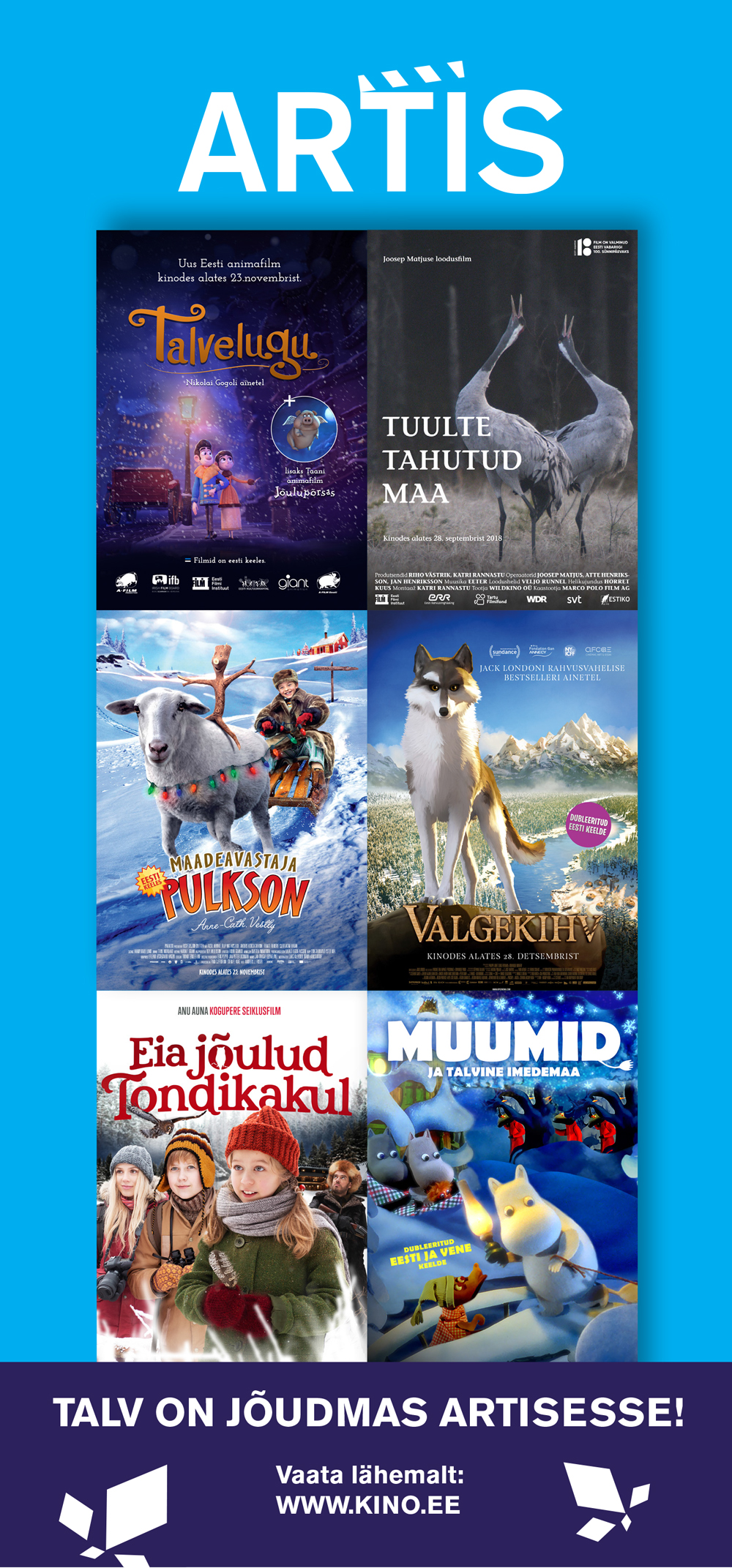 Algklassidele pakub Artis vaatamiseks värsket Eesti-Taani koostöös valminud lühianimatsioonide duot „Talvelugu“ (2018) ja „Jõulupõrsas“ (2012). Esimene filmidest on imekaunis ja õpetliku sisuga lugu noormehest, kes loodab tänu uhkele talvemantlile võita oma kolleegide sõprust. Animatsioon põhineb vene kirjandusklassiku Nikolai Gogoli tuntud lühijutul „Sinel“. Teine lugu, „Jõulupõrsas“ on lugu notsust, kes avastab, et teda armastusega kasvatanud perekond on teinud seda vaid maitsva jõuluprae huvides, ja peab siis otsustama oma edasise saatuse.
