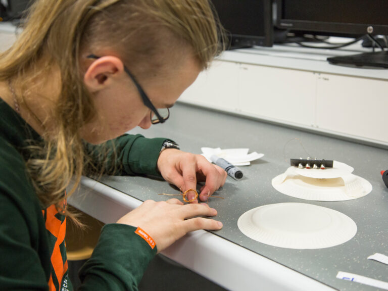 Polütehnikumi energeetika-automaatika töötubades sai ehitada käepärastest vahenditest kõlari, aga teha ka lihtsamaid jootetöid või valmistada vilkuvate tulukestega eset. Foto: Teele Raja