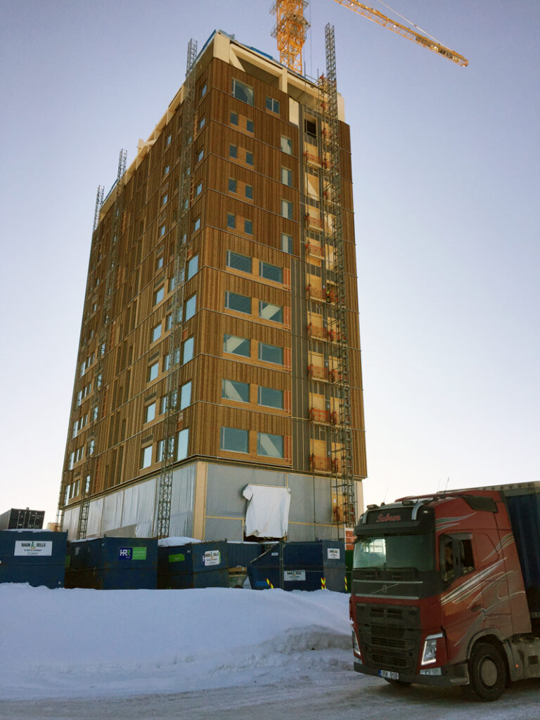 Norra ehituskooli õpilased tegid uurimistöö kõrge puithoone kõikumisvõimalusest. Et vähendada kõikumist mõnest meetrist mõne sentimeetrini, on 8. korrusest kõrgemal laed betoonist, mis lisavad hoonele raskust. Kõik tugitalad on liimpuidust.