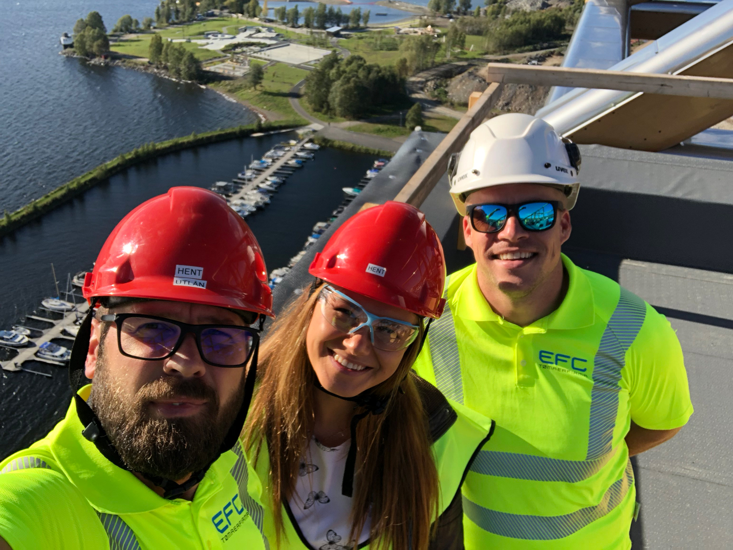 Objektijuhid Raido Vetesina ja Rain Rõngelep, keskel ettevõtte sisseostujuht Elise Kopelman Norra kõrgeimas puithoones. Foto: Raido Vetesina