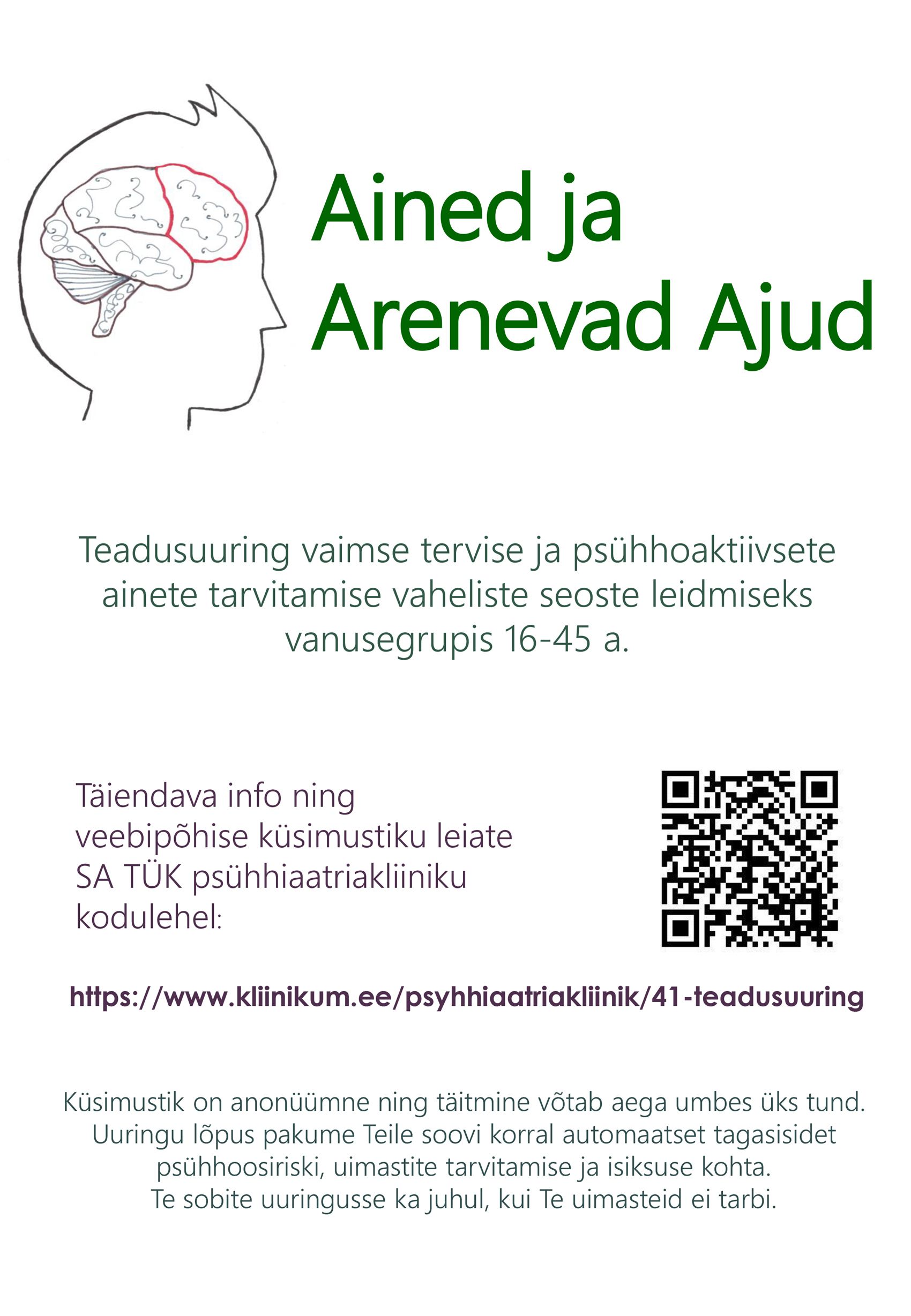 Kutsume osalema kõiki 16–45-aastaseid Eesti elanikke, uuringusse sobivad ka need, kes tunnevad end tervena ega ole uimasteid tarvitanud. Anonüümse küsimustiku täitmine võtab aega umbes tunni. Soovijad saavad küsimustiku lõpus tagasisidet oma isikuomaduste, ainete tarvitamise ja psühhoosiriski kohta. Kui jagate infot oma õpilastega, aitate muuta abi vaimse tervise probleemide korral paremaks ja kättesaadavamaks!