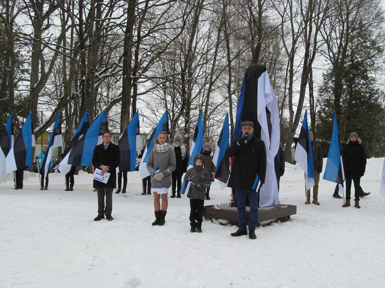 Kui pärast aktust saalitäis rahvast kooliõue samba juurde suundus, seisid seal õpilased lippudega rivis. Mälestusmärgilt eemaldasid katte 1. klassi õpilane Sten Eric Hansen ja gümnaasiumi lõpetav Chätlyn Parts, Tori vallavanem Lauri Luur ja diplomaat Jüri Trei, kes on praegu ilmuva Peterburi Teataja toimetaja ning selles tegevuses Seljamaa mantlipärija.