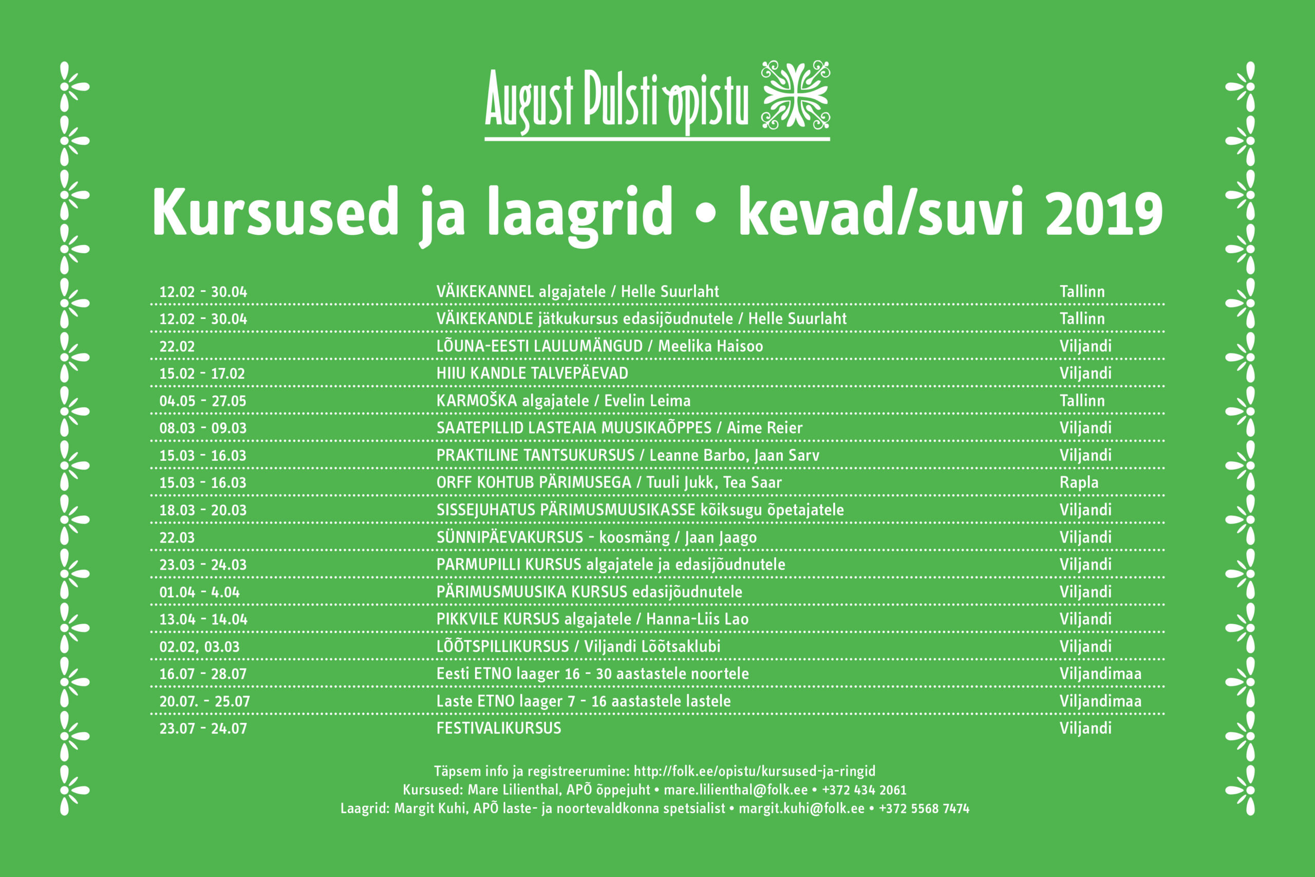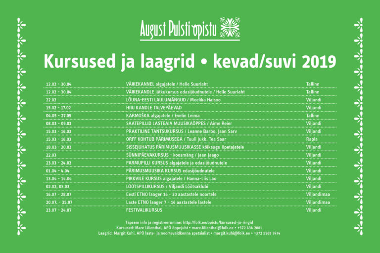 Hiljem osalesin veel mitmel Pulsti õpistu kursusel ning kuulun nüüd ka Viljandi pärimusmuusika festivali ja Reval Folgi vabatahtlike meeskonda.
