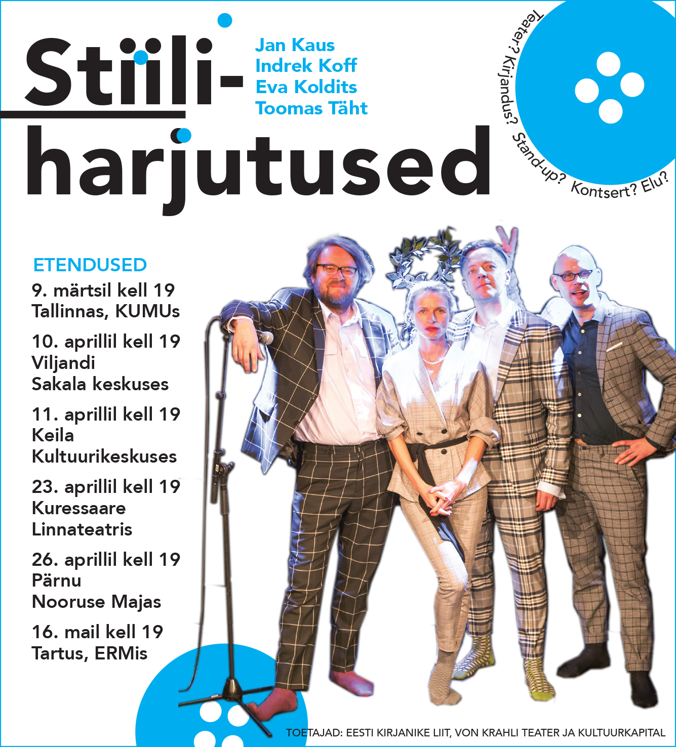 Eva Kolditsa lavastus „Stiiliharjutused“ (esietendus 10. märtsil 2018) asetab kirjanikud keset teatrit ja näitlejad keset kirjandust. Tulemuseks särtsuv tervik, milles koos teatrietendus, kirjandusõhtu, stand-up ja bändiproov. Praeguseks on lavastusel seljataga 20 etendust kaheksal laval. Lisaks Eestile on antud etendusi Berliinis, Brüsselis ja Luxembourgis. 2019. aasta kevadel jõuavad stiiliharjutajad Eesti eri nurkadesse – lisaks Tallinnale ja Tartule ka Viljandisse, Kuressaarde, Pärnusse ja Keilasse.