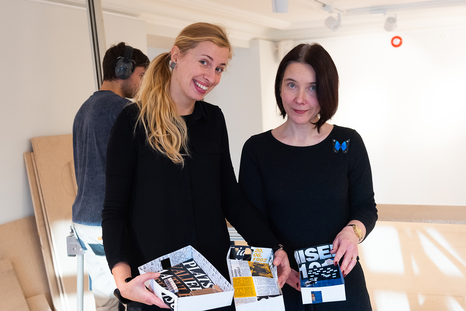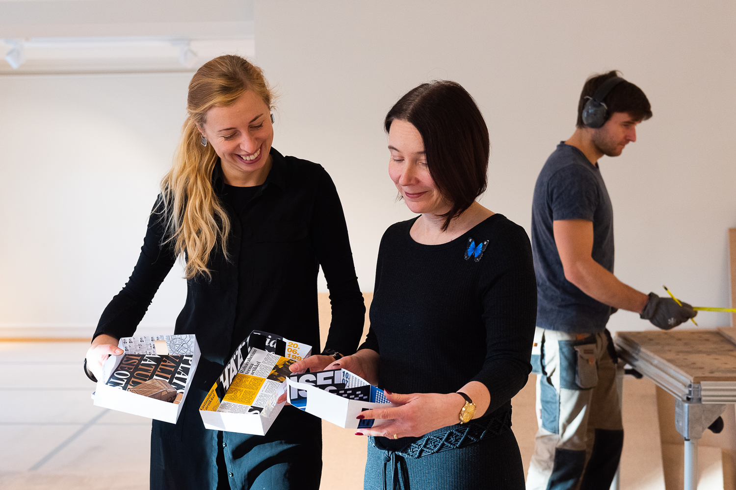 Kristi Paatsi ja Pille Rohtla näituse „Vali parem minevik!“ näituse ehitamise keskel. Foto: Vahur Lõhmus