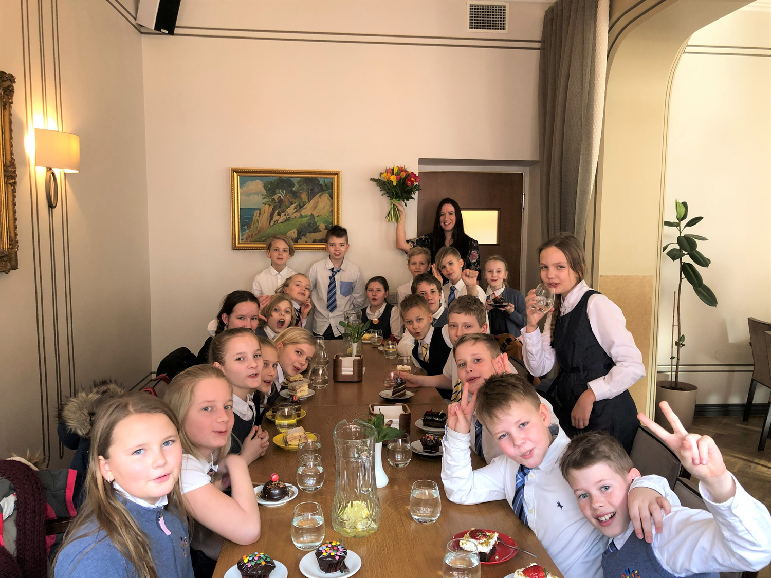 Peetri lasteaia-põhikooli 4.e klassi õpilased ja nende õpetaja Helen Pullinen tähistasid kirjutamisvihikute eest keeleteo auhinna saamist ühise kohvikus käiguga. Fotod: erakogu
