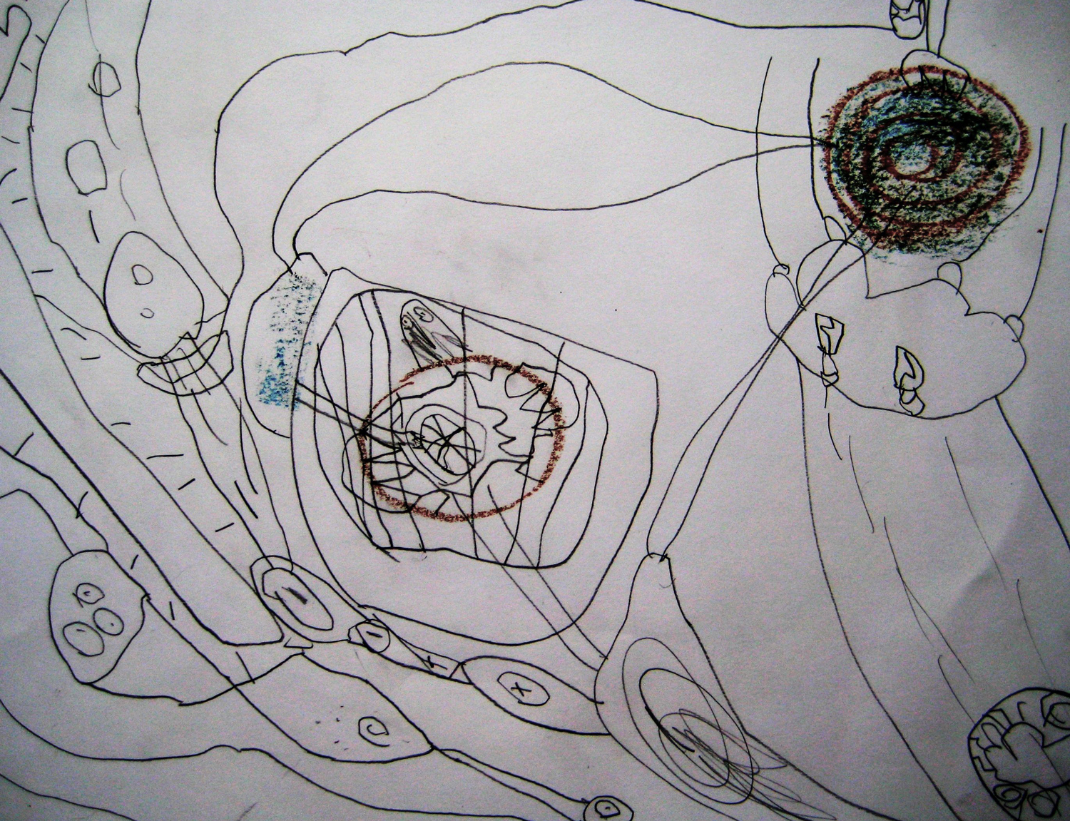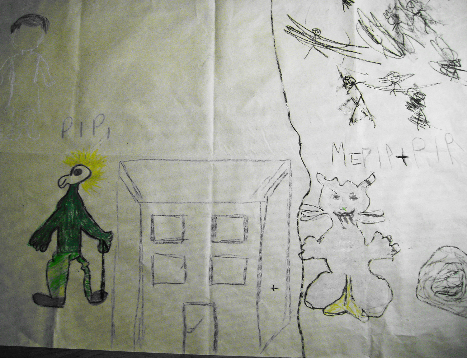 Õpilase ja terapeudi koostöös valminud pilt fantaasiategelastest Mepip + Pip ja Pipi. Pildi paremasse ülemisse serva joonistatud mustad mehikesed on koopainimesed. Alguses olid nad suhteliselt karmid, tapsid inimesi, kuid viimasel ajal ei ole nad selle poisi piltidesse enam ilmunud. Fotod: Marika Ratnik