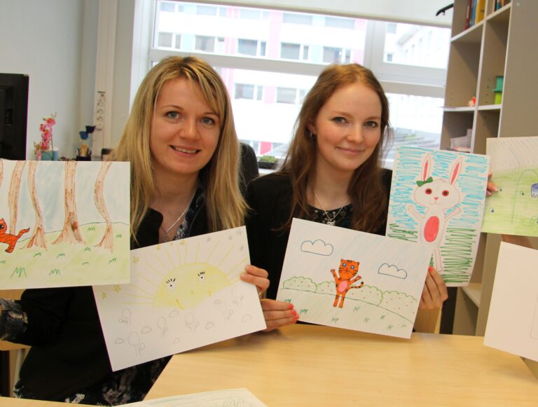 Keeleduši eestvedajad Kaidi Marmor ja Marii-Helen Kebbinau näitavad joonistusi, mida lapsed on lauludušiga seoses joonistanud.