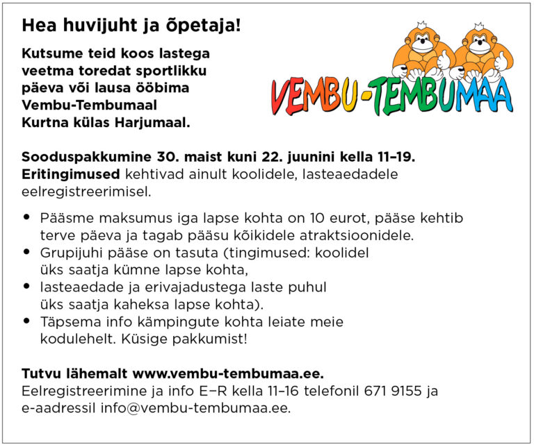 Vembu-Tembumaa on koguperepark, mis on tegutsenud juba 18 aastat. Pakume aktiivse tegevuse võimalust, meil on atraktsioonid alates veeliumägedest ning lõpetades ronimisradadega. Seega tuleb riietuda vastavalt ilmale ja kindlasti sportlikult.
