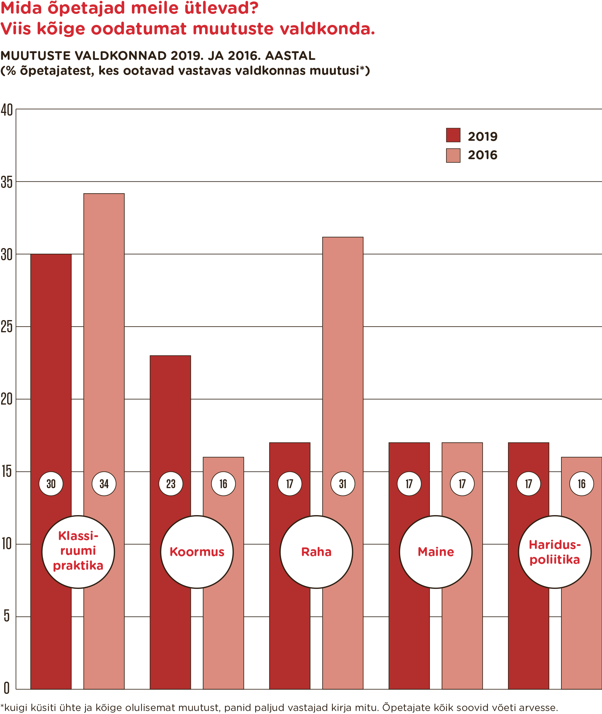 Kui klassiruumi praktika oli ootuste liider mõlemas uurimuses, siis teise koha osas on kolme aasta jooksul toimunud muutus. Aastal 2016. oli kindlalt teisel positsioonil rahaga seotu: koolide rahastamine ja õpetajate palgad – „Õpetaja sipleb olmemuredes, kuna raha ei jätku“. Tänavuses uurimuses on rahateema mõnevõrra taandunud, ju on palgatõus mõju avaldanud. Siiski, umbes kuuendik õpetajatest pidas ka nüüd palgatõusu kõige olulisemaks asjaks, mis Eesti koolis peaks juhtuma.