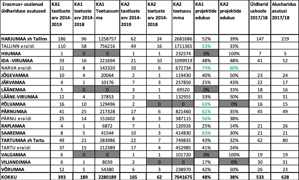 Tabelis on kokkuvõte Erasmus+ üldhariduse õpirände (KA1) ja strateegilise koostöö (KA2) taotlustest 2014–2019 ja toetusesaajatest 2014–2018 (2019. aasta andmed on selgumisel) ning eraldatud toetussummadest maakondade lõikes (sh on eraldi välja toodud Tallinn, Tartu, Pärnu ja Narva). Lisatud on ka üldhariduskoolide ja lasteaedade arv vastavas maakonnas.