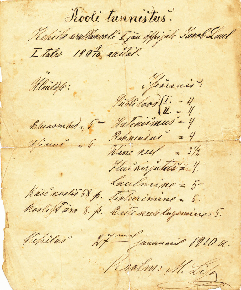 Vaadates vanu dokumente ja koolitunnistusi, ilmneb ilmekalt Jakob Laulu püüd hariduse järele. 12-aastaselt kihelkonnakooli minnes oli ta kõige noorem õpilane. Lugemise oli ta kodus selgeks saanud, piibli ja saksa keele sõnaraamatu ka selleks ajaks juba läbi töötanud. Hindamine oli karm ja 4+ igati tubli hinne, sest vaid Jumal teadis viiele. Kihelkonnakooli haridusest piisas, et valla- ehk külakooli õpetajaks saada. 27. novembril 1914 määras Kihelkonna vallanõukogu ta 15-aastasena Pajumõisa vallakooli õpetajaks. Ametis sai ta siiski olla vaid neli päeva, kuni kooliinspektor Kuressaarest selle otsuse tühistas. Õpetaja Laul oli veel liiga noor ja leeritamata. Osa õpilasigi vanemad. Inspektor soovitas aasta hiljem samas kohas jätkata. Aastal 1921 sai ta kätte algkooliõpetaja kutseõiguse ja aastast 1923 oli koolijuhataja Pidulas. Pidula kool tegutses Pidula mõisas aastatel 1922‒1970. Seitseteist aastat (1923–1940) juhatas kooli Jakob Laul.
