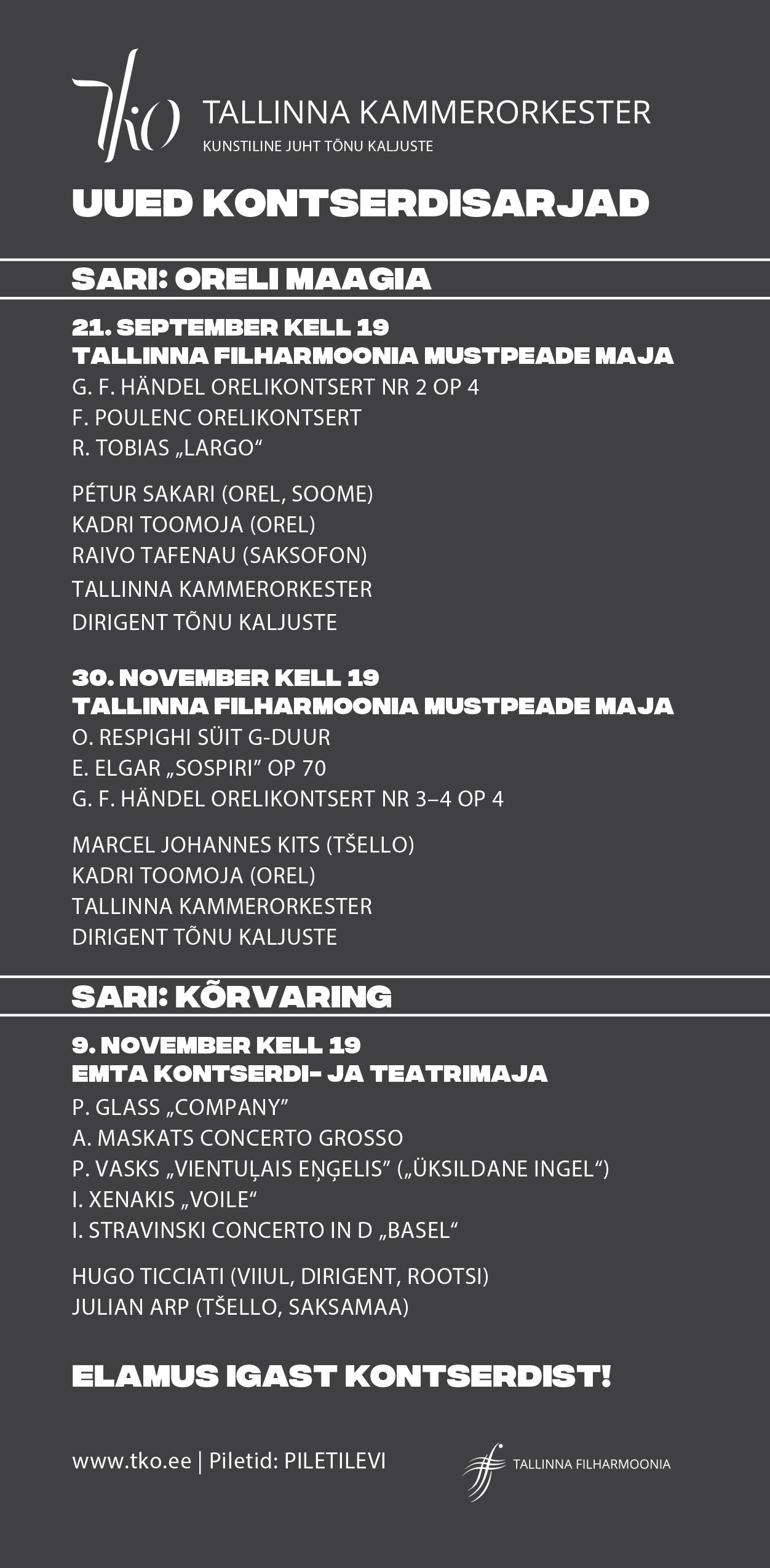 Tallinna Kammerorkestri kontserdikavas on sel hooajal teinegi uus sari. „Oreli maagia“ pakub kuulajatele kogemusi uutmoodi helide kooskõlast. Selle sarja kontsertidele kaasatakse Tallinna Filharmoonia Mustpeade maja Valge saali uudisinstrument elektriline orel, mille digitaalsed helivõimalused on tähelepanuväärsed ja pakuvad üllatusi.