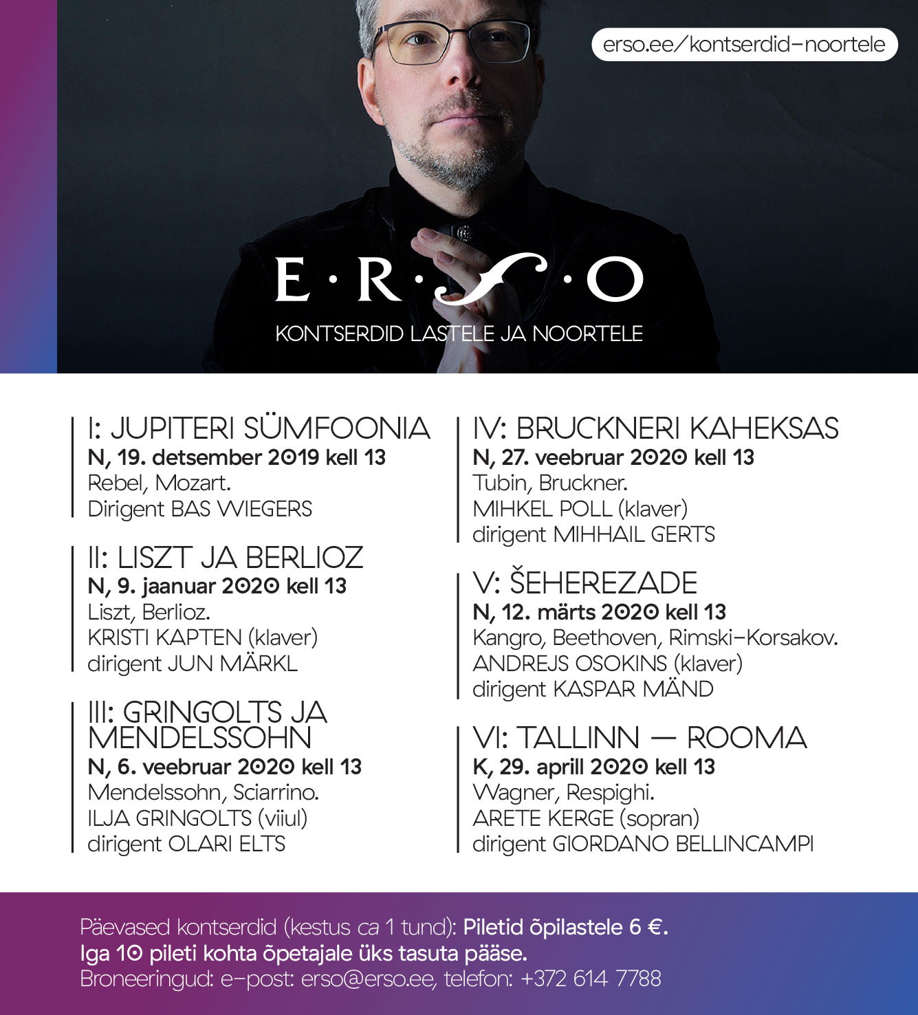 ERSO selle hooaja kuus lõunakontserti asetavad õpetajate ette tõeliselt kõva pähkli – mida võtta, mida jätta. Oma intriig ja põnev teema, mida õpilastele tutvustada, on neist igaühes, suurepärased solistid ja dirigendid koos Eesti esindusorkestriga samuti.