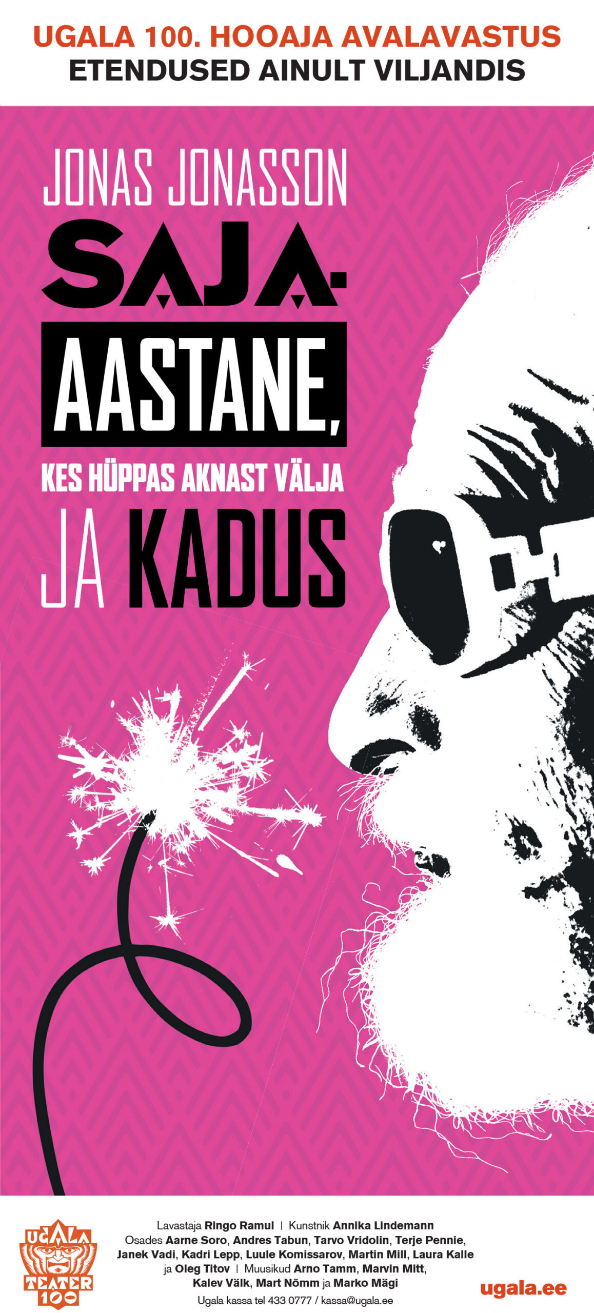 Ugala teatri 100. hooaeg avati väärikale vanusele pühendatud lavastusega „Saja-aastane, kes hüppas aknast välja ja kadus“. Lavastust mängitakse vaid Viljandis Ugala teatri suures saalis, kasutades selleks ära pea kõik lavatehnilised võimalused. Loo keskmes on äsja 100-aastaseks saanud Allan Karlsson, keda kehastab Aarne Soro. Oma 100. sünnipäeval otsustab Allan jätta seljataha elu Viljandi eakate kodus ning akna kaudu põgeneda. Algab peadpööritav ja plahvatusrohke tagaajamine läbi suvise Viljandimaa, aga ühtlasi ka rännak läbi Allan Karlssoni elu ja maailma lähiajaloo sõlmpunktide. Rootsi kirjaniku Jonas Jonassoni 2009. aastal ilmunud esikromaanil põhineva lavastuse dramaturg on Priit Põldma ning lavastanud on selle Ringo Ramul.